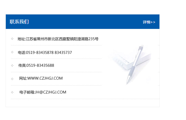 地址:常州市新北區友邦商務大廈1幢16、17層  電話:0519-85101652  傳真:0519-85112595  郵編:213022  網址:www.cz-jiayue_cn.lnwanda.com  郵箱:xiajifengaa@163.com